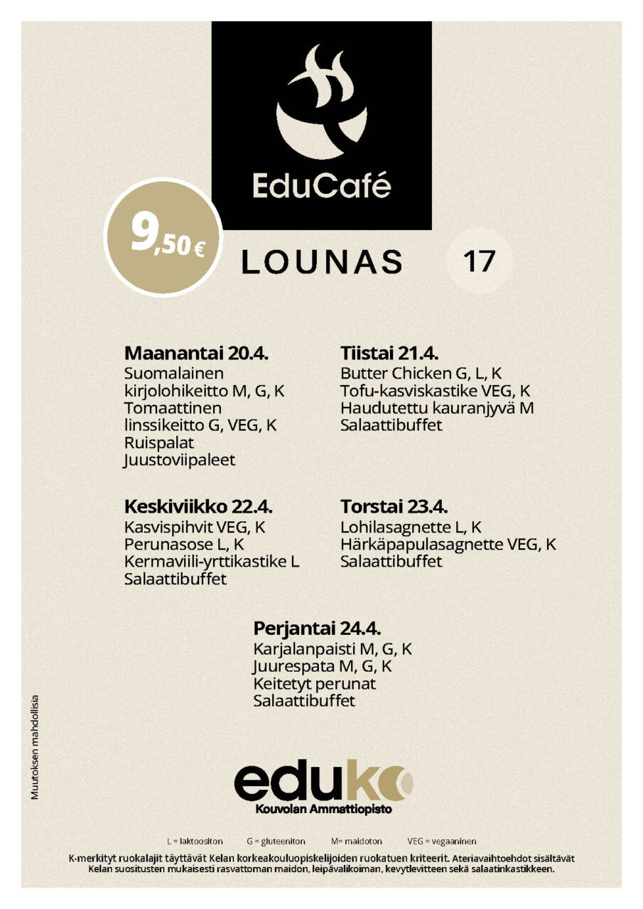 EduCafé palvelee Kouvolan keskustassa Kohoa Synergiakeskuksessa maanantaista perjantaihin klo 9-14. Tarjolla on lämmin lounas linjastosta klo 11.00-13.00 (9,50 €).